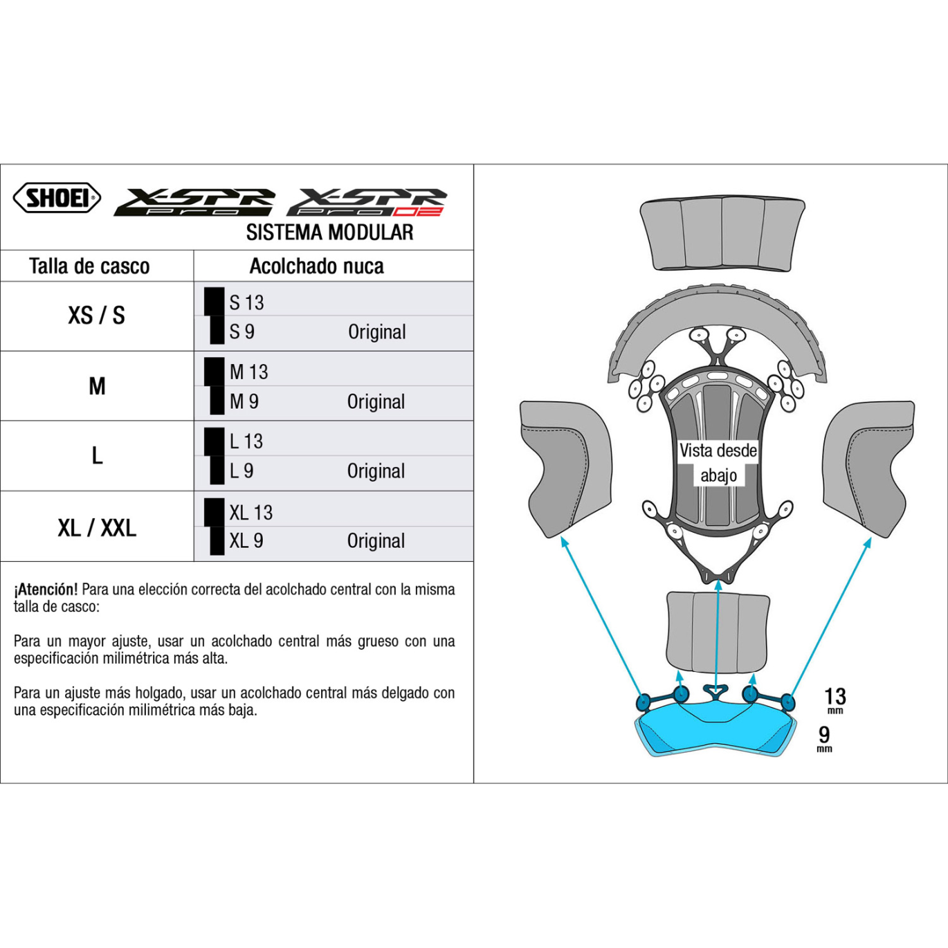 Puede encontrar la talla del acolchado original en la etiqueta que encontrará en la parte posterior de este. También puede saberlo mediante la talla de su casco de moto Shoei X-SPR Pro.